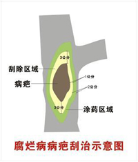 3、刮除病斑。在休眠期刮掉病粗皮,集中燒毀。亦可在7~8月重刮皮。