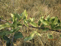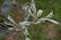 主要為害嫩枝、葉片、新梢,也為害花及幼果。病部滿布白粉是此病的主要特征。幼苗被害,葉片及嫩莖上產(chǎn)生灰白色斑塊,發(fā)病嚴重時葉片萎縮、卷曲、變褐、枯死,后期病部長出密集的小黑點。大樹被害,芽干癟尖瘦,春季發(fā)芽晚,節(jié)間短,病葉狹長,質(zhì)硬而脆,葉緣上卷,直立不伸展,新梢滿覆白粉。生長期健葉被害則凹凸不平,葉綠素濃淡不勻,病葉皺縮扭曲,甚至枯死。