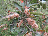 主要為害葉片,也能為害嫩枝、幼果和果柄 。葉片初患病正面出現(xiàn)油亮的橘紅色小斑點,逐漸擴大,形成圓形橙黃色的病斑,邊緣紅色。發(fā)病嚴重時,一張葉片出現(xiàn)幾十個病斑。發(fā)病1~2周后,病斑表面密生鮮黃色細小點粒,初為桔黃色,后變?yōu)楹谏。病斑背面隆起,叢生淺黃色毛狀物。果實受害,初生黃色小點,后變褐色,病斑四周有與葉背相同的毛狀物。