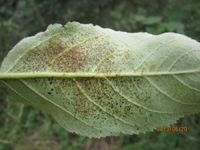 以菌絲體在被害葉和枝條上越冬。翌年春季產(chǎn)生分生孢子,隨氣流傳播,侵染春梢嫩葉。一般果園在花后即可出現(xiàn)病葉,在后半月病葉增多。春雨早而多,夏季有連陰雨,病害發(fā)生早且重,7月上中旬即有落葉。田間在病斑出現(xiàn)后20天即開始產(chǎn)生分生孢子,可再侵染。此病喜侵染35天內(nèi)的嫩葉,尤其是20天內(nèi)的新葉。