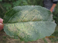 病菌在檜柏上為害小枝,即以茵絲體在菌癭中越冬。第二年春天形成褐色的冬孢子角。冬孢子柄被有膠質(zhì),遇降雨或空氣極潮濕的胺化膨大,冬孢子萌發(fā)產(chǎn)生大量擔孢子,隨風傳播到蘋果樹上。銹菌侵染蘋果樹葉片、葉柄、果實及當年新梢等,發(fā)病期持續(xù)一個月。