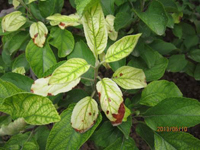 多從新梢嫩葉開始,初期葉肉變黃,葉脈持綠,隨病勢葉片變成黃白色,重時葉片邊緣枯焦,新梢頂端枯死。