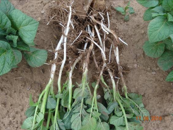 試驗(yàn)背景:隨著馬鈴薯面積的擴(kuò)大,連作障礙土傳性病害越來越嚴(yán)重,特別是像黑痣病、枯萎病近2年發(fā)生特別嚴(yán)重,而且治療非常困難。市面上防治這類病害的藥劑效果好的很少。2014年由于前期地溫比較低、濕度大,黑痣病感染比較嚴(yán)重,有的甚至已經(jīng)感染匍匐莖,嚴(yán)重影響到馬鈴薯的生長(zhǎng)。