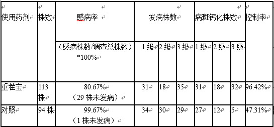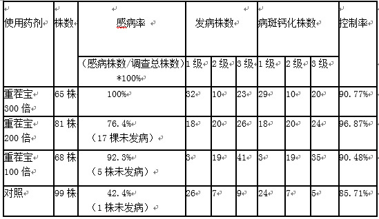 2、 用藥處理后,大多數(shù)植株病斑已鈣化,病情發(fā)展得到控制,其中重茬寶200ml/畝控制率達(dá)到96.42%,其中對(duì)發(fā)病較輕的植株(1級(jí)、2級(jí))控制率達(dá)到100%。