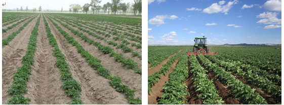 馬鈴薯培土可使植株埋入土下的節(jié)數(shù)增多,增加匍匐莖的數(shù)量,形成更多和更大的塊莖,防止干旱裂畦,塊莖見光導(dǎo)致薯皮發(fā)青。在苗期當(dāng)株高10~15厘米左右時,結(jié)合中耕除草進(jìn)行第一次適當(dāng)培土,做到鋤通壟背、靠緊壟眼,除盡雜草,不傷根苗;在苗高25厘米左右時進(jìn)行第二次中耕培土,培土5~7厘米;在開花前進(jìn)行第三次中耕鋤草,高培土,以利于結(jié)薯。