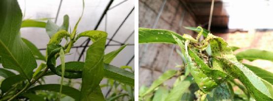 蚜蟲主要為害桃樹幼嫩枝葉,春季當(dāng)桃樹發(fā)芽展葉時(shí),蚜蟲聚集桃樹嫩枝和新葉上,用細(xì)長(zhǎng)的口針刺入植物組織內(nèi)部吮吸汁液,桃葉受害后呈現(xiàn)黑點(diǎn)、紅色或黃色斑點(diǎn),葉卷曲皺縮,導(dǎo)致葉片干枯或提前脫落,嚴(yán)重影響桃樹枝葉正常生長(zhǎng)。同時(shí)蚜蟲排泄的蜜露、污染葉面及枝梢,使桃樹生理活動(dòng)受阻,常造成煙煤病,同時(shí)加速桃葉早期落葉。