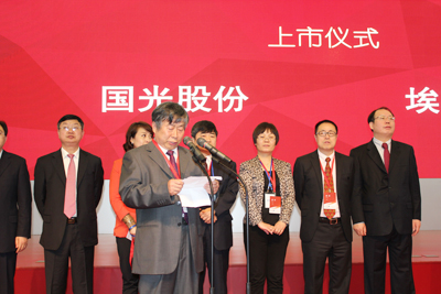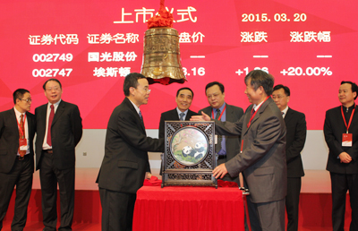 2015年3月20日上午,四川國光農(nóng)化股份有限公司上市儀式在深圳證券交易所隆重舉行。公司董事長顏昌緒,資陽市委書記、市人大常委會(huì)主任周喜安、農(nóng)業(yè)部藥檢所總農(nóng)藝師季穎、中國農(nóng)藥工業(yè)協(xié)會(huì)會(huì)長孫叔寶、中共資陽市委常委郎寬、資陽市人民政府副市長毛紹百、簡陽市人民政府市長趙春淦等政府主要領(lǐng)導(dǎo)及公司董事、監(jiān)事、高管出席了上市儀式。