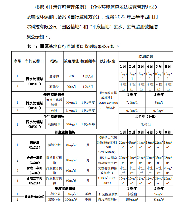 四川潤爾科技有限公司自行監(jiān)測信息公示