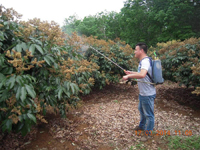 對于花帶葉和沖梢的類型,進(jìn)行脫小葉處理。在荔枝妃子笑品種上進(jìn)行化學(xué)藥劑脫小葉處理:國光乙烯利3-5ml/15kg,配合磷鉀營養(yǎng)。白糖罌等品種上不進(jìn)行化學(xué)藥劑脫小葉處理,一般進(jìn)行人工摘葉處理。