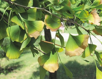 近年來,該銀杏樹出現(xiàn)樹勢衰弱的情況,銀杏葉片小,甚至部分枝條不發(fā)葉的情況,較多老葉邊緣出現(xiàn)焦枯的現(xiàn)象;林業(yè)部門立即聯(lián)系國光名木古樹救護(hù)人員,邀請技術(shù)員到現(xiàn)場對古銀杏進(jìn)行診斷。通過現(xiàn)場檢測發(fā)現(xiàn)古銀杏根部的土壤通透性差,土壤PH值偏堿,土壤中有機(jī)質(zhì)缺乏;挖開根部的土壤,觀察發(fā)現(xiàn),古銀杏根系有腐爛的情況,根部土壤水分含量較高;較多葉片出現(xiàn)邊緣焦枯的現(xiàn)象(圖1)。