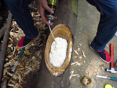 3、防腐材料涂抹好后,放置一段時(shí)間,晾干后,用聚氨酯泡沫填縫劑從底部開始填充樹洞(圖3);
