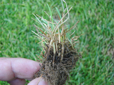 拔出“剛”感病的草坪草,發(fā)現(xiàn)根部、根莖部已黑褐色腐爛,且植株會輕輕拔起