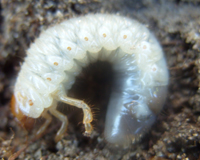 蠐螬體肥大,體型彎曲呈C型,多為白色,少數(shù)為黃白色。頭部褐色,上顎顯著,腹部腫脹。體壁較柔軟多皺,體表疏生細毛。頭大而圓,多為黃褐色,生有左右對稱的剛毛,剛毛數(shù)量的多少常為分種的特征。如華北大黑鰓金龜?shù)挠紫x為3對,黃褐麗金龜幼蟲為5對。蠐螬具胸足3對,一般后足較長。腹部10節(jié),第10節(jié)稱為臀節(jié),臀節(jié)上生有刺毛,其數(shù)目的多少和排列方式也是分種的重要特征。
