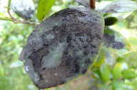 煤污病主要危害植物的葉片,也危害嫩枝、花器等部位。發(fā)病初期在葉面、枝梢表面上形成圓形黑色小霉斑,有的沿主脈擴展,后擴大連片,使整個葉面、嫩梢上布滿黑霉層,形成較厚的黑色或黑褐色的煤煙狀層,嚴重時形成黑色霉層,有時在干燥條件下霉層開裂剝落。