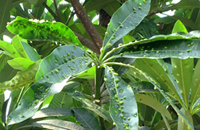 2、根據(jù)調(diào)查發(fā)現(xiàn),成蟲產(chǎn)卵期和若蟲危害期與盆架子新芽、新葉的生長期吻合,因此針對易發(fā)區(qū)域,應(yīng)建議在新葉萌發(fā)期普遍噴施內(nèi)吸性的農(nóng)藥如崇刻(50%啶蟲脒水分散粒劑)2000-3000倍進(jìn)行預(yù)防。若已經(jīng)被危害的區(qū)域,鑒于木虱危害的隱蔽性以及噴藥難以接觸蟲體的特點(diǎn),建議選用內(nèi)吸滲透性藥劑,且最好在葉面出現(xiàn)“包狀物”而葉背面未出現(xiàn)黑褐色羽化孔前噴霧,建議用 “必治”(稀釋1000倍)與“依它(稀釋1000倍)”混合液葉面噴施,連用2-3次,間隔5-7天噴一次; 此方案用藥前后的對比如下(見圖4、圖5)。